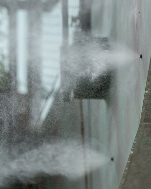 The Condair outdoor cooling system incorporates a high pressure pump and water treatment station that feeds water to a network of nozzles located in the area to be cooled. A variety of nozzle systems are available, depending on the requirements of a project.