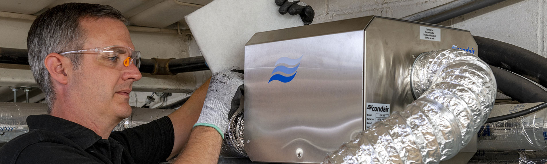 Firstly, which technology to use? There are two main types – condensing and desiccant. A condensing system collects moisture by condensing it on a cold surface and then sending it to drain. A desiccant literally adsorbs moisture by passing air through a desiccant rotor.